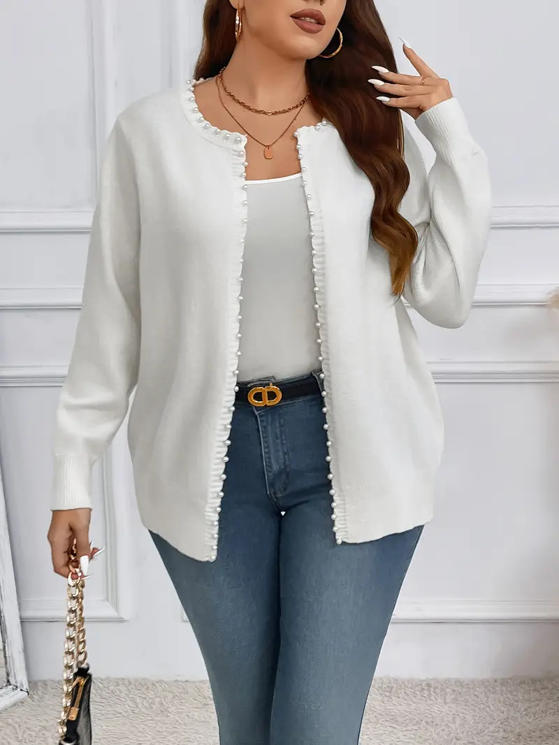 Solid Color Pearl Trim Long Sleeve Cardigan Plus Size Knitwear